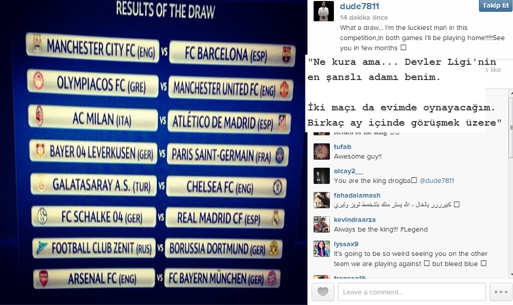 Chelsea forması ile efsaneleşen Drogba kuradan memnuniyetini sosyal ağ sitelerinden Instagram'daki hesabından dile getirdi.