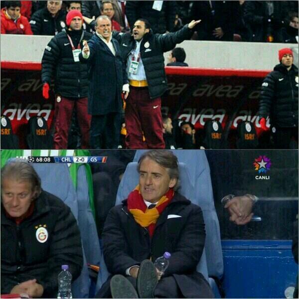 Galatasaraylı taraftarlar, eski teknik direktör Fatih Terim'in yedek kulübesinde oyuncularına kızarken çekilen bir fotoğrafını paylaşırken aynı fotoğrafın altına da Roberto Mancini'nin Chelsea deplasmanında çekilen görüntüsünü ekledi.