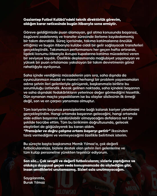 Burak Yılmaz, istifa kararını "Gaziantep Futbol Kulübü'ndeki teknik direktörlük görevim, aldığım karar doğrultusunda bugün itibarıyla sona ermiştir. Göreve başladığımızda puan alamayan, gol atmakta zorlanan ve özgüveni düşük bir takımı devraldık. Süreç içinde önemli transferler gerçekleştirerek takımı ligde Avrupa kupalarına katılma mücadelesi veren bir seviyeye taşıdık. Özellikle deplasmanda mağlubiyet yaşamayan ve yüksek puan ortalaması yakalayan bir ekip bırakmanın gönül rahatlığı içindeyim. Saha dışında da oyuncularımızın maddi ve manevi sorun yaşamamaları için başkan ve şehrin ileri gelenleriyle görüşerek sorumluluk üstlendik. Ancak saha içi ve dışındaki çabalarımızın yeterince değer görmediğini hissettik; dün yaşananlar bunun en çarpıcı örneği oldu. Tüm kariyerim boyunca prensiplerimden taviz vermeden ilerledim. 'Prensipler ve doğru çalışma ortamı başarıyı getirir' ilkesinden ödün vermedim, vermeyeceğim." açıklamasıyla paylaştı.