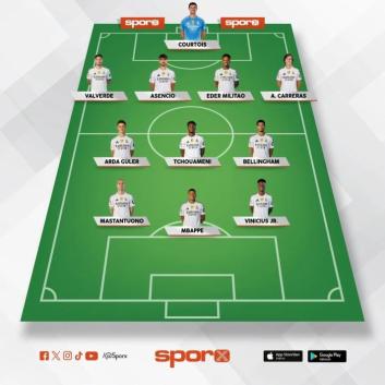 Courtois, Valverde, Asencio, Militao, Carreras, Arda, Tchouameni, Bellingham, Mastantuono, Vinicius Jr, Mbappe.